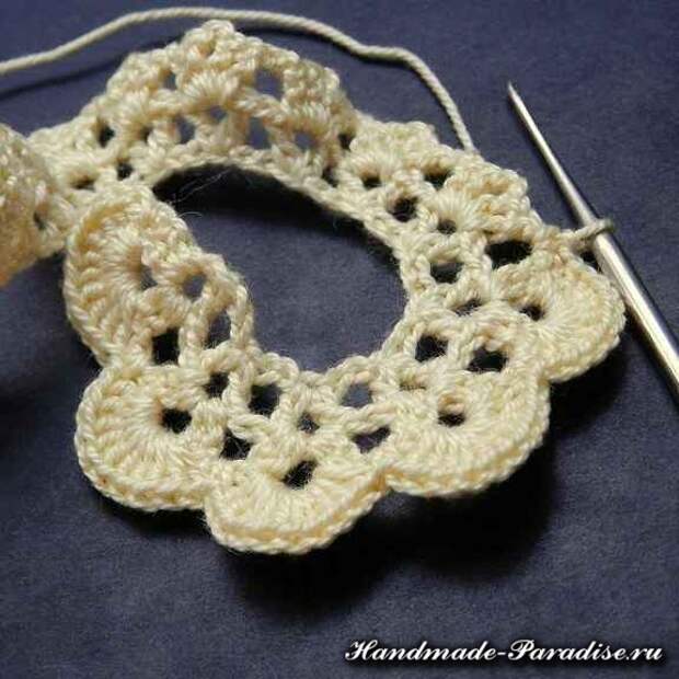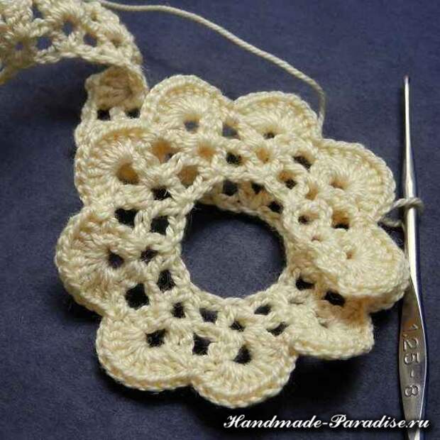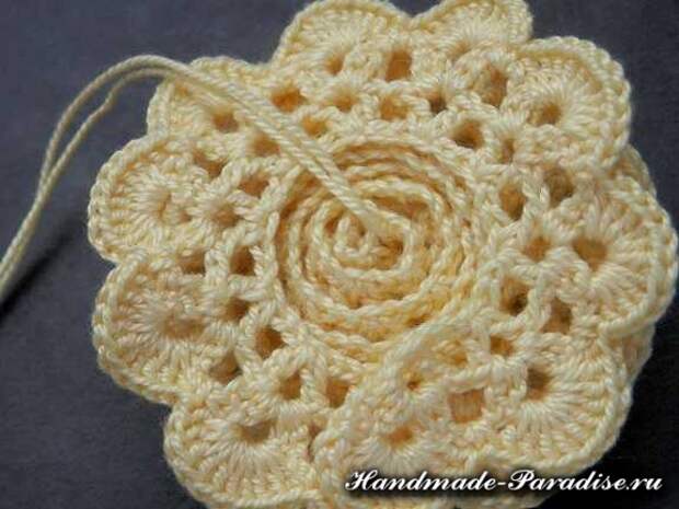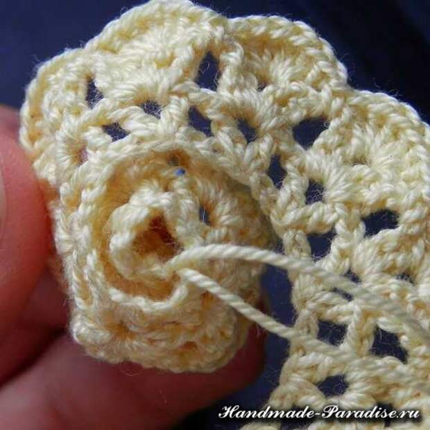 Последний четвертый ряд розочки крючком вяжется столбиками с накидом - по 10 столбиков.
