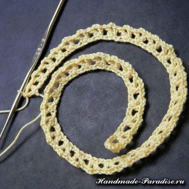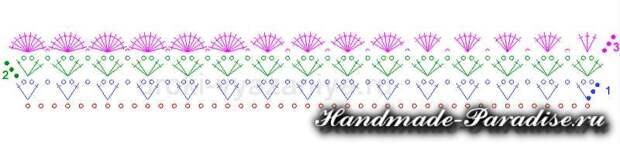 Работу начинаем с вязания цепочки из воздушных петель, затем вяжется первый ряд столбиками с накидом с воздушными петлями. Смотрите схему выше.