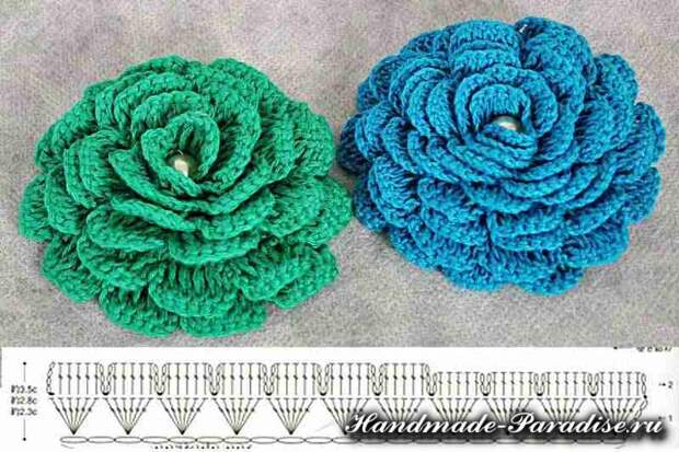 Третий ряд розочки также вяжется столбиками с одним накидом и воздушными петлями по схеме.