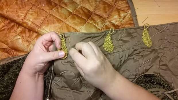 Сначала убираем старую застёжку: отпарываем пуговицы и аккуратно вручную зашиваем петли от пуговиц. Увеличивать куртку будем за счёт нахлёста, который был, когда куртка застёгивалась на обычные пуговицы. Сделаем так, чтобы планки легли встык и установим красивую декоративную застёжку клевант. Если вы хотите упростить задачу, то можете купить набор готовых застёжек, если же хочется сэкономить, то сделайте их самостоятельно. В сети есть много вариантов, как их сплести.