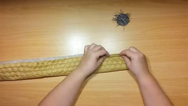 На полосе для правой планки отчертите 1 см на припуск и сложите ткань пополам, расположив край на проведённой полосе. Сколите деталь булавками. Затем закройте припуском край и приметайте.