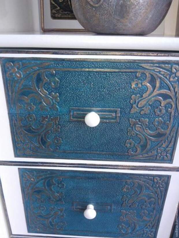 Стоял он в ванной комнате. Я сняла слой старой краски с помощью шлифовальной машинки. Нанесла грунтовку. Взяла фактурные обои. Вырезала нужные мне части по размеру ящиков.