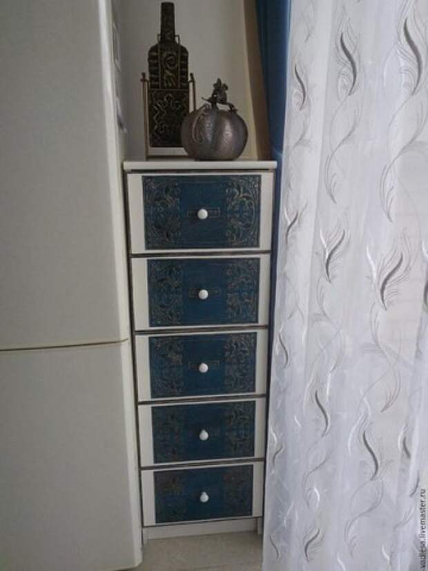 Дальше, любимые мои мастера, я не буду утомлять вас своим графоманством и не буду писать, как в один прекрасный для Комода день, в комнату вошла Хозяйка в рулеткой в руках, а за нею Хозяин с чемоданчиком, где что-то побрякивало. Не буду писать, как возрадовался Комод, когда Хозяин поработал над ним своими волшебными инструментами. Не буду писать, как Хозяин сказал Хозяйке: "Ничего у тебя не получится из этой затеи!". И уж тем более не буду писать, что на это ему ответила Хозяйка. :) А только покажу обновленный Комод. Теперь он стоит на голубой кухне, где всегда много света, и есть, что посмотреть-послушать! И Хозяйка каждый раз, выдвигая его ящички, говорит Хозяину: "А ты хотел его выбросить!" И Комод, слыша эти слова, улыбается от счастья и тихонько закрывает свои ящички без единого скрипа!