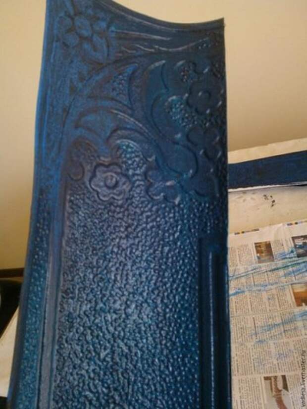 По выпуклым частям прошлась бронзой. И наклеила покрашенные полоски обоев на ящики клеем Момент Монтаж. Всё покрыла акриловым лаком в 4 слоя.