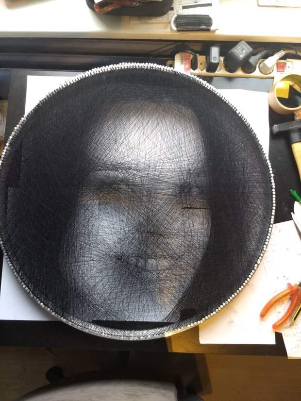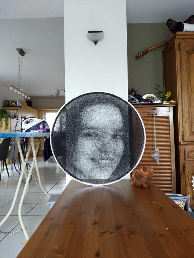 Умелец, известный в сети под ником kmmeerts, творчески подошел к выбору подарка для возлюбленной. Используя самые доступные материалы, мужчина создал настоящий шедевр. Только вместо кисти и холста ему потребовались нитка, гвозди и велосипедный обод. Взгляните на процесс создания оригинального портрета.