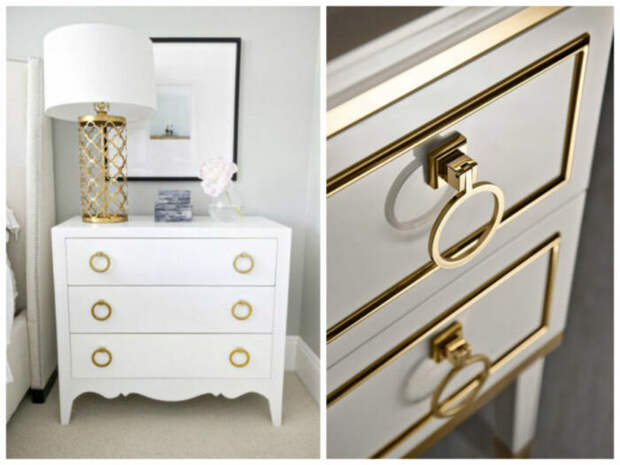 Речь не только о фурнитуре, но и о том, как украсить большой объем шкафчика, который уже был окрашен и обновлен. В запасе у многих найдутся интересные, но больше ненужные аксессуары, которые можно применить для отделки. Или их можно купить недорого в магазине, выбирая металлические уголки, бусины и всё, что приглянулось из ассортимента.