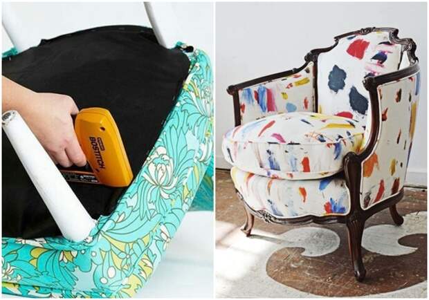 Перетяжка только звучит сложно, как что-то, где понадобятся услуги мастеров. Но на самом деле обновить сидение или спинку стула, кусочек пуфа или покрытие дивана можно и своими руками. Для этого понадобится только новое тканевое полотно на ваш вкус, а также саморезы или скобомет. Если нет уверенности в том, что получится перетянуть все правильно, можно попросту снять замеры с диванов и кресел и сшить собственными руками новый, яркий чехол, который скроет дефекты.
