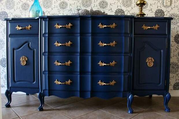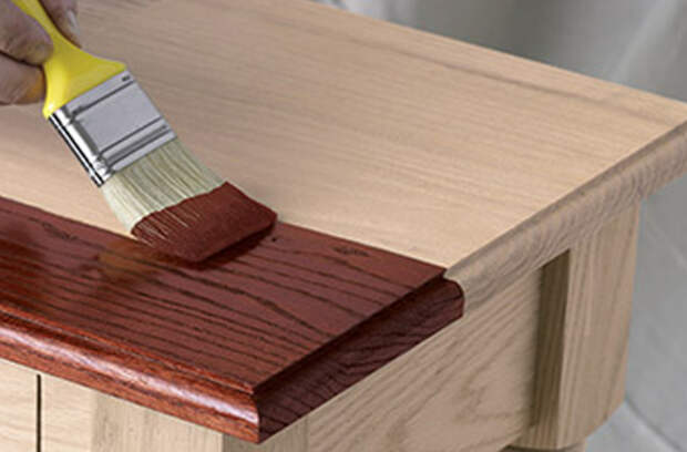 Этот способ актуален только для мебели из натурального дерева. Морильная краска отлично подчеркивает натуральную древесную текстуру, делает её визуально богаче и ярче, а ещё у неё существует достаточно много оттенков. Для этого мебель предварительно обтирают наждачной бумагой, удаляя старые слои краски, покрывают кондиционером, и только затем наносят морилку, которая должна лечь ровным слоем. Чтобы зафиксировать результат лучше покрыть её сверху матовым или глянцевым лаком.