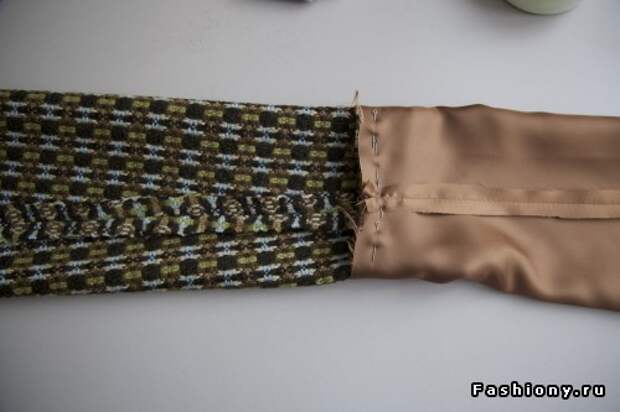 Прикалываем, сметываем и пристрачиваем 1 см от края подкладку рукава.