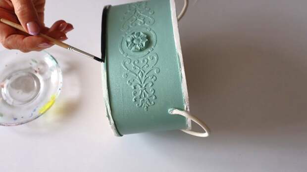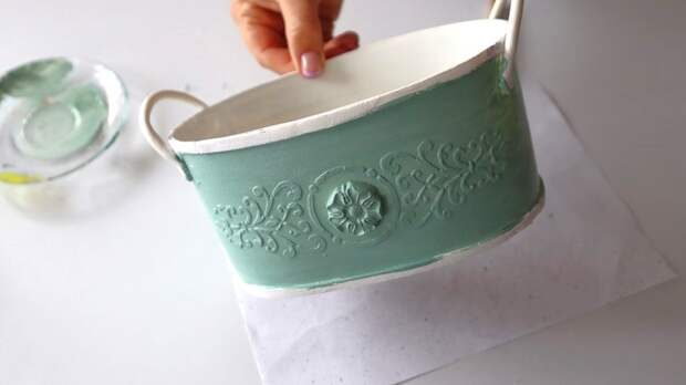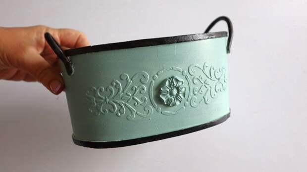 - Из самозатвердевающей глины раскатала жгутики для ручек. Приклеила к кашпо по бокам и оставила до полного высыхания.