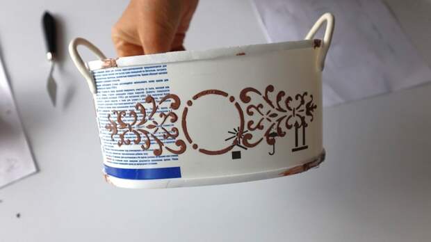 - С помощью трафарета и шпаклевки нанесла рисунок.