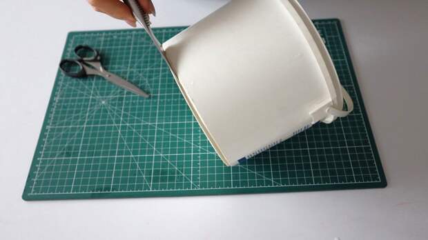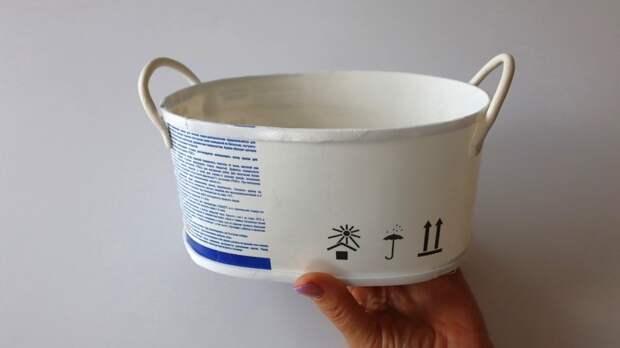 - Для этого канцелярским ножом отрезала дно и верхний ободок. Края подравняла. Согнула срезанное ведерко в овал, обвела дно на картон. Приклеила картонное дно с помощью горячего клея. Чтобы кашпо не разгибалось, сверху приклеила скотч и положила кашпо на батарею. После этого овальная форма больше не разгибалась.