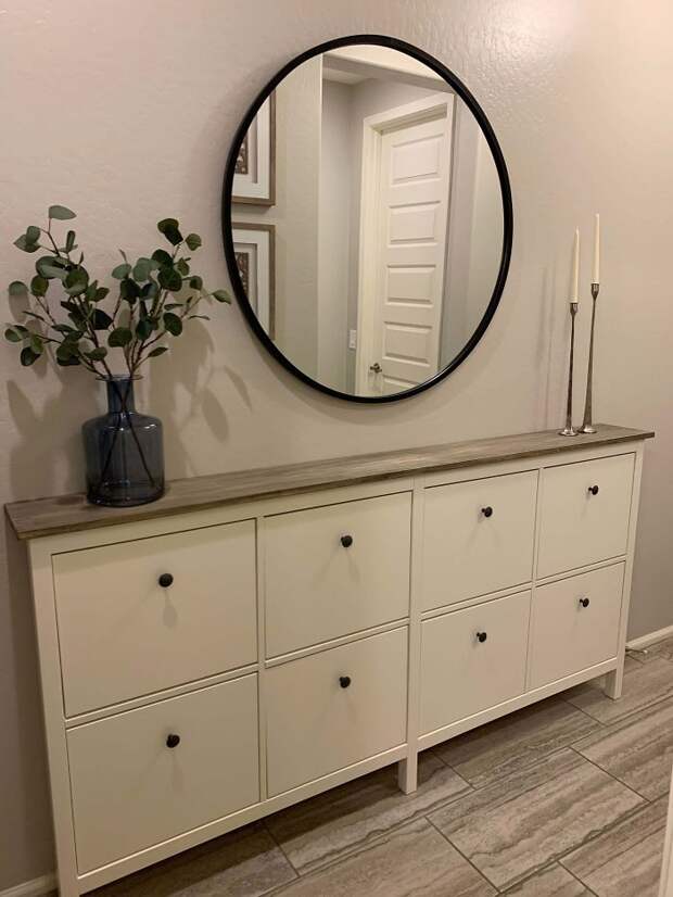 Для нашего узкого прохода мы объединили два обувных шкафа IKEA Hemnes и заменили оригинальную столешницу на столешницу из окрашенного дерева