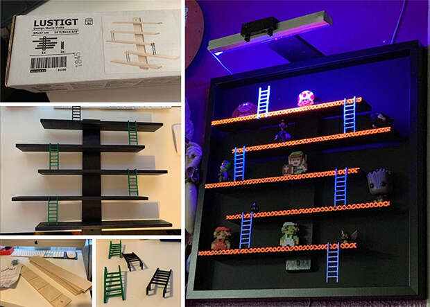 Я сделал это из продуктов ИКЕА (кроме краски и «черного света»). Это полка для крошечных игрушечных персонажей Nintendo для моей подруги
