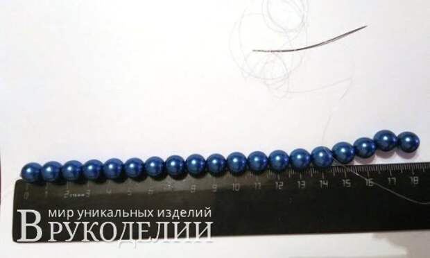 2. Набираем на нить бисеринку – стоппер, чтобы бусины, которые мы будем набирать далее, не сползали с нити. Далее бусины размера 10мм, 19 шт. (количество рассчитывается индивидуально, зависит от объема запястья).
