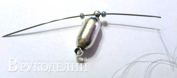 Нить выходит из бусины со стороны застежки. Набираем 7 бисерин – 1 бусину размер 6 – 7 бисерин.5. Заводим иглу во вторую бусину в обратном направлении.