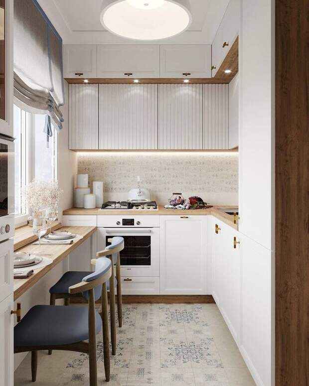 Правильный выбор цветов и освещения способен визуально расширить пространство. Светлые тона (белый, пастельные оттенки) делают кухню более воздушной и светлой. Не бойтесь добавлять яркие акценты — они привнесут жизнь в интерьер.