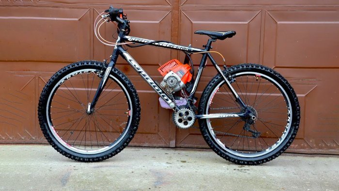 Поскольку после установки на велосипед в качестве привода двигателя от мотокосы необходимость в педалях отпадает, то их просто снимаем. Также с мотора демонтируем узел, выполняющий функции основания.