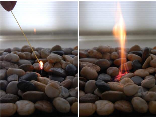 Самодельный биокамин мало чем отличается от заводского: стандартной емкости с топливом хватает на несколько часов непрерывного горения. После чего можно заменить одну банку на другую, «разобрав» камин. Либо аккуратно перелив топливо через «окошко» среди камней. Не бойтесь пролить жидкость — она имеет обычный спиртовой запах.