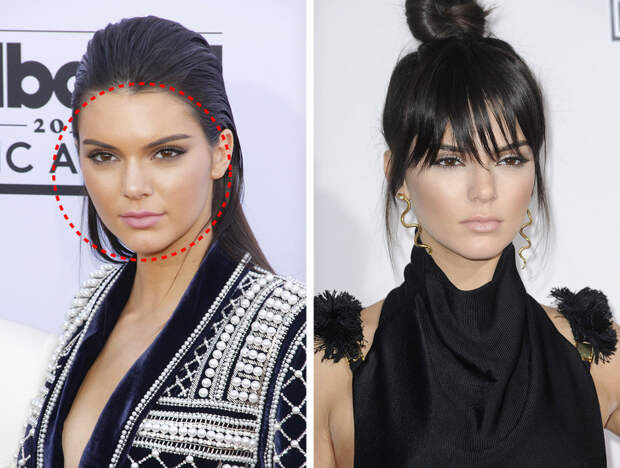Круглое лицо можно визуально вытянуть длинной рваной челкой, как это сделала Кендалл Дженнер. Такой вариант не только делает лицо более овальным, но и помогает добавить образу элегантности, особенно в сочетании с высокой прической.