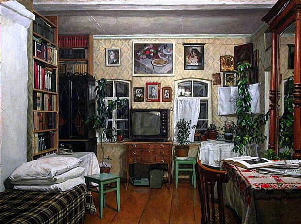 04. Интерьеры жилых комнат в те годы выглядли тоже не слишком презентабельно. Вот на этой картине отлично переданы детали советского интерьера тех лет — смесь витиеватых доревролюционных предметов, дешевой артельной мебели (крашеные табуретки), самодельных книжных полок. Расставляли мебель, как правило, строго по периметру комнаты, в середине мог стоять только стол.