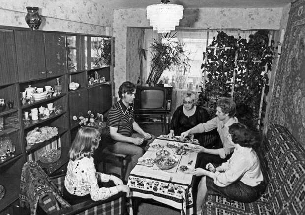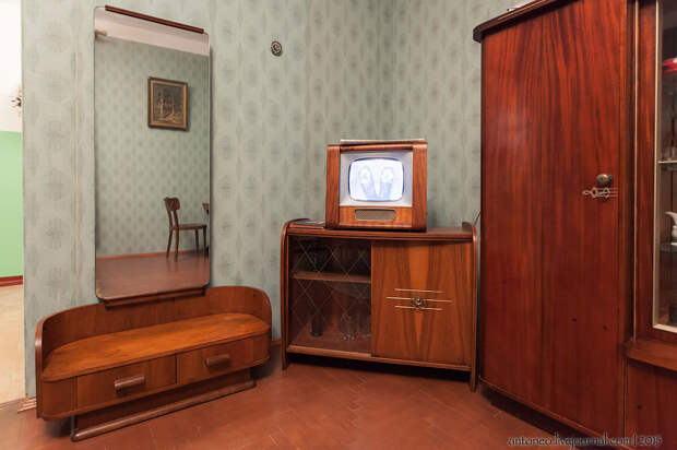 08. Примерно в то же время (конец 1960-х — начало 1970-х годов) в домах стали появляться полированные "стенки", причем были они практически в каждой советской квартире. Особенно качественными считались "стенки," произведенные в соцлагере, но не на территории СССР — в ГДР, Румынии либо ПНР. "Стенка" ставилась обычно в самой большой комнате в доме и имела множество функций — в ней хранили ценные сервизы, книги, одежду и т.д., а на застекленные полки часто выставляли фотографии или просто красивые картинки.