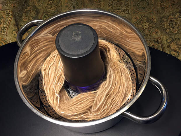 Затем внутреннюю конструкцию нужно извлечь из кастрюли прямо целиком. Шерсть, естественно, будет совсем мокрой.