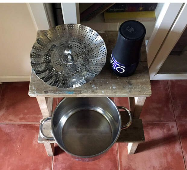 Для эксперимента по запариванию нам понадобятся: пароварка, большая кастрюля, какая-нибудь вертикальная штука для центра