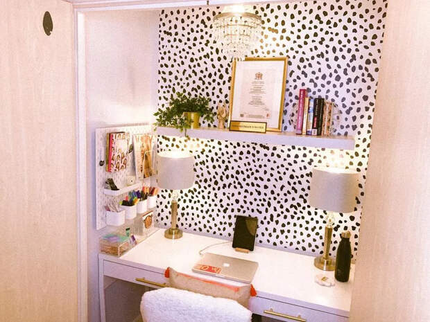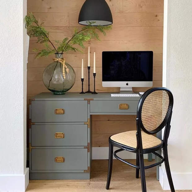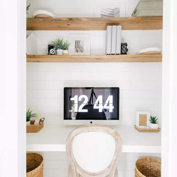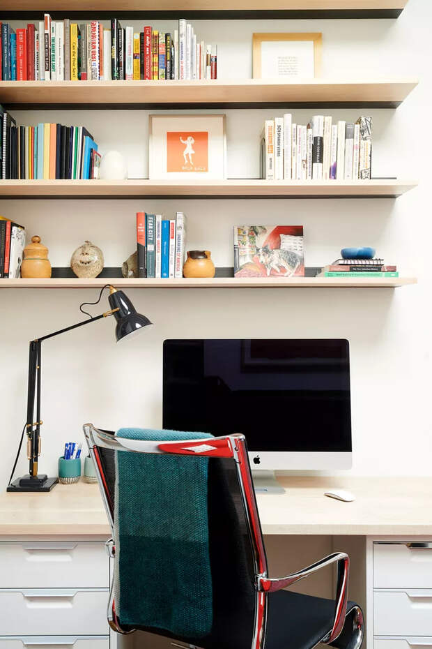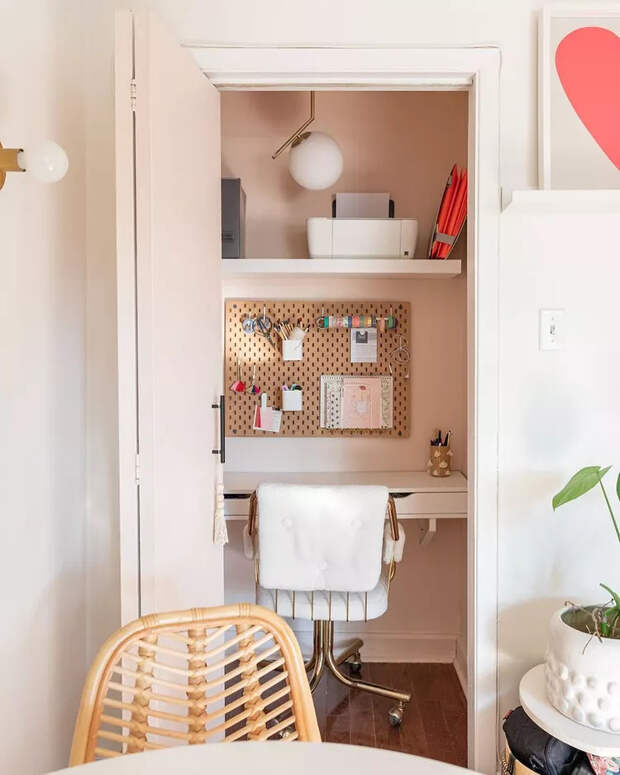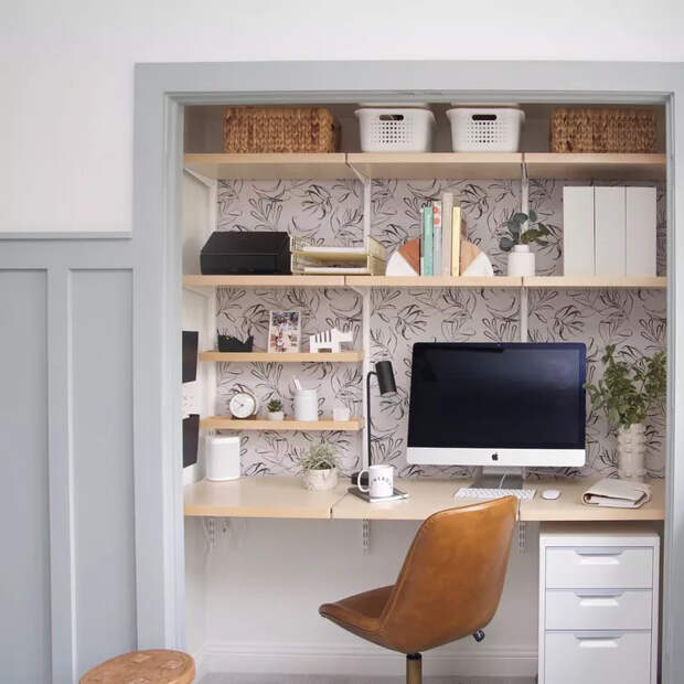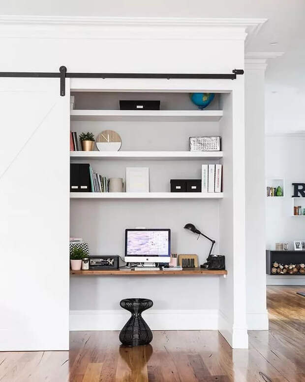 Организуйте функциональное вертикальное хранение, установите легкий, но удобный подвесной стол, подумайте о хорошем освещении, добавьте декор и идеальный офис, скрытый от посторонних глаз, будет готов.