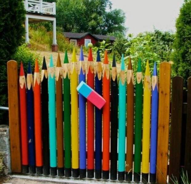 Забор сделан из карандашей разных цветов и смотрятся они круто и творчески. Так и хочется сказать фразу «Так легко выглядеть крутым, когда ты ничего не сделал» Остро заточенные они защитят от проникновения.