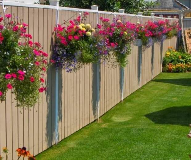Кашпо с цветами на заборе не делают его неприступным, а скорее привлекают гостеприимством знакомых и соседей.