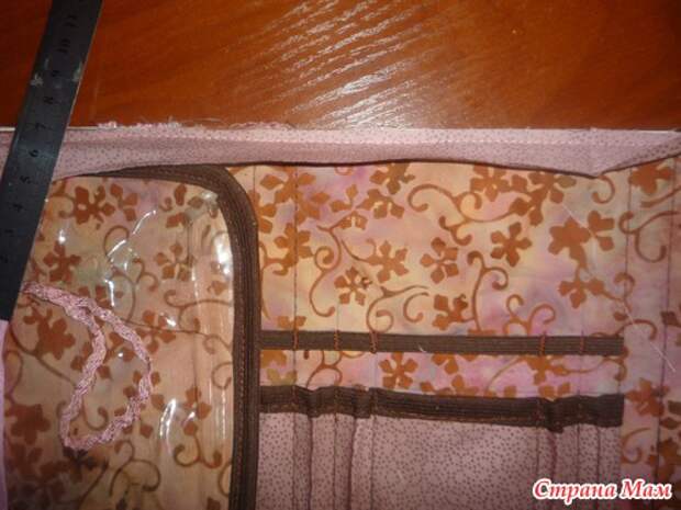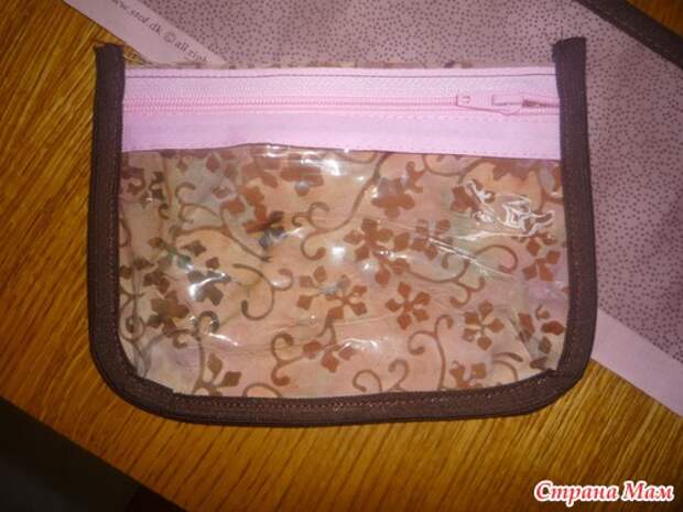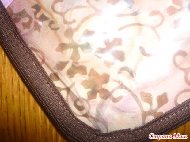 обстрачиваем всю вкладку по периметру поверх пленки ПВХ, в уголках я заложила складочки, чтоб карман был объёмным