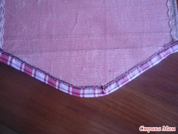 Обрабатываем срезы по приметру косой бейкой. Сначала обшиваем место прикрепления вкладыша, потом длинные края