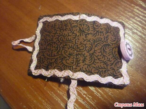 Заправляем внутрь оставшиеся открытыми срезы, вкладываем в срединке отрезок тесьмы( за этот хвостик будем пришивать к основе) и обстрачиваем игольницу по периметру, подкладывая декоративную тесьму