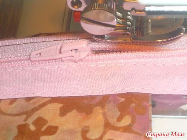 для этого прикладываем молнию к краю пленки изнаночной стороной вверх, прострачиваем, затем молнию отгибаем наверх, закрываем место соединения молнии и пленки косой бейкой