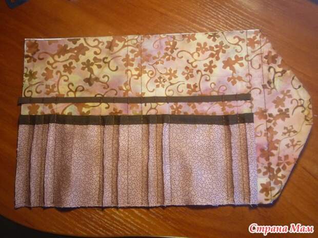 Размечать начинаем со стороны, которая будет прилегать к клапану ( у меня правая) на лицевой стороне ткани, сначала отступ от края 1см(припуск на шов втачивания) его надо перенести и на изнаночную сторону кармана, потом двигаясь влево так: 2 см,2 см, 6см, 2см,2см, 1.5 см, 2см, 2 см, 5 см, 2 см, 2см, 1см. Заметываем излишки по 0,5см на каждой ячейке( как на кармане для крючков)