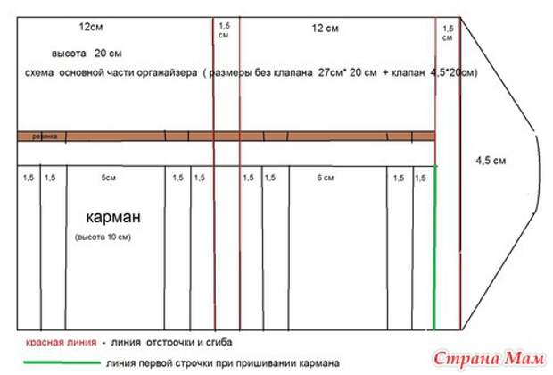 Там, где на схеме линия обозначена красным цветом, строчку прокладываем через всю основную деталь, делая закрепочки в начале ячеек. остальные ячейки прострачиваем только по карману, так же закрепляя концы.