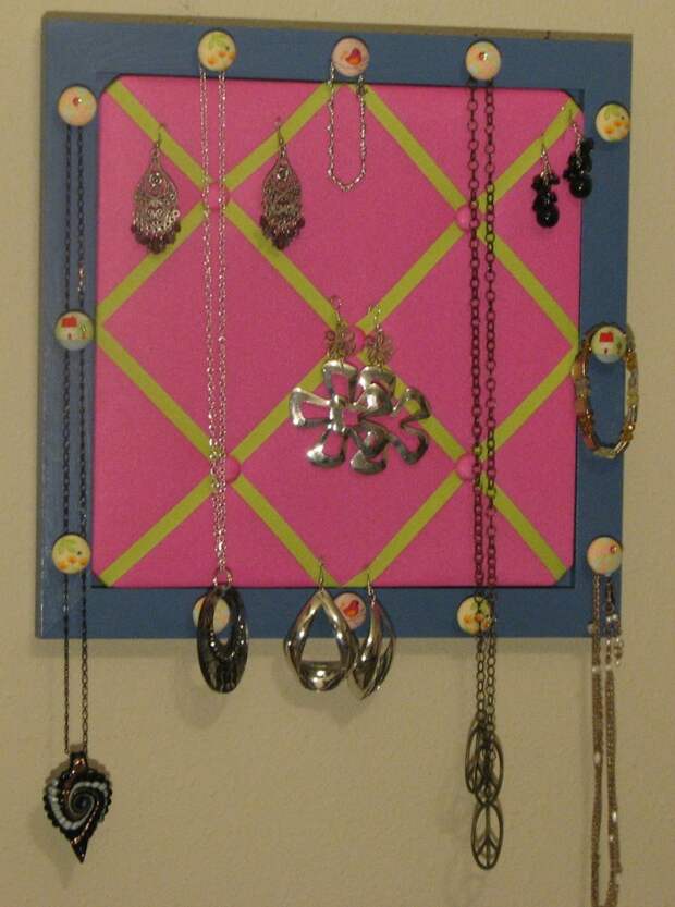 - На такой доске можно хранить и свою коллекцию украшений, так же прикалывая булавками, или цепляя, например, серьги за перетяжку. А можно сразу вкрутить крючки, или красивые маленькие, мебельные ручки, или просто вбить маленькие гвоздики и хранить бижутерию и разные штучки