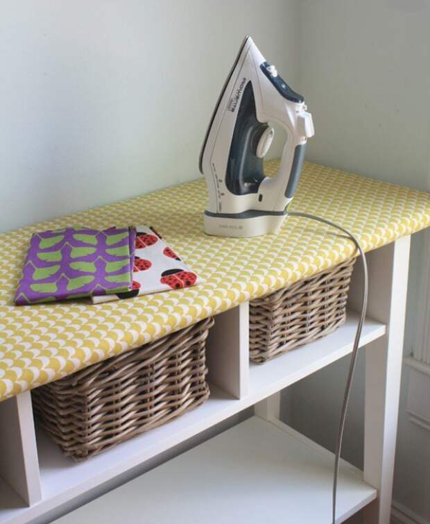 Самый простой вариант — выделить для глажки какую-либо напольную полку или столик и накрыть или обить поверхность плотной тканью. Вариант такой допустим.