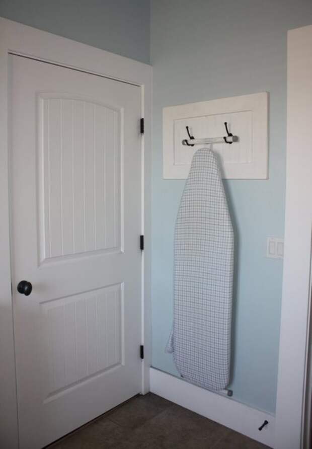 5. Если у вас уже есть гладильная доска, то можно купить либо интересный чехол, который заметен, или наоборот тот, что не будет привлекать к себе внимание, и разместить за дверью! Возможно хранение доски и на самой двери, но в этом случае следует учитывать степень травмоопасности. Если у вас есть дети, то стоит хлопнуть дверью посильнее, и доска может неожиданно упасть. Поэтому за дверью и на стене, мне кажется, вариант более удобный: