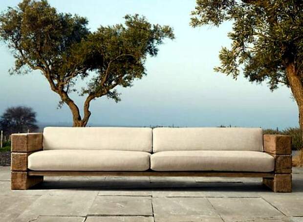 Простой и в тоже время элегантный диван, сделанный из грубых деревянных брусков и лаконичных светлых подушек, выполненных на заказ, прекрасно впишется в интерьер современной гостиной или в ландшафт загородного участка.
