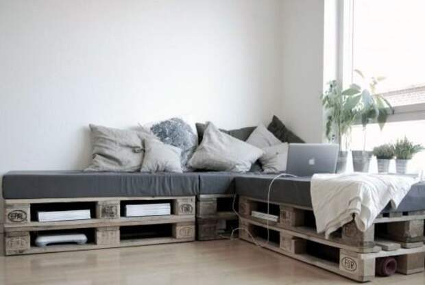 Невысокий угловой диванчик с полочками для книг, который можно смастерить своими руками из деревянных поддонов и больших мебельных подушек, прекрасно впишется в интерьер квартиры, оформленной в скандинавском, рустикальном или стиле лофт.