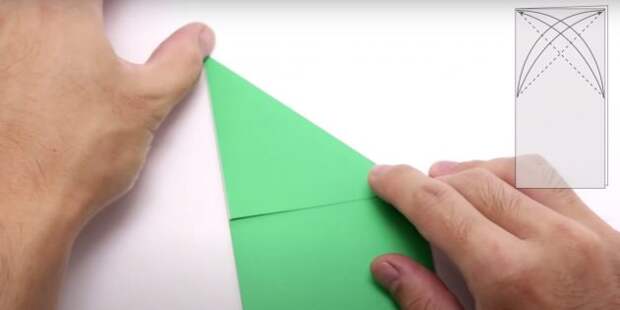 Разогните. Снова сложите по сгибу правую часть. Свободный уголок уведите вправо, чтобы получился небольшой треугольник.