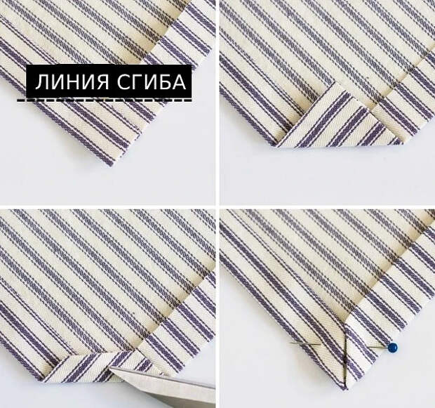 Чтобы сделать такие уголки, на этапе кроя закладывайте припуски по 2 см с каждой из сторон. Сначала подогните и заутюжьте края на 1 см, затем ещё на 1 см.
