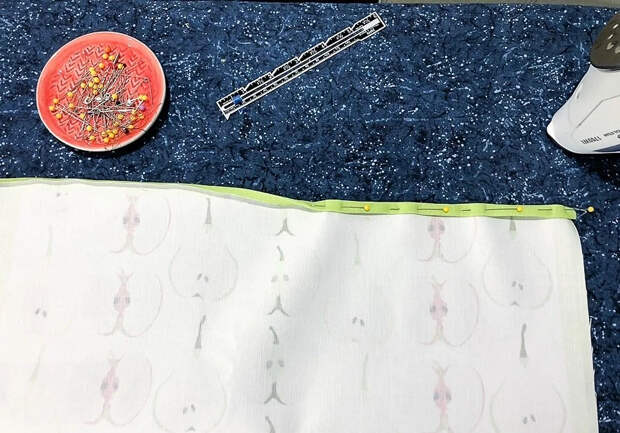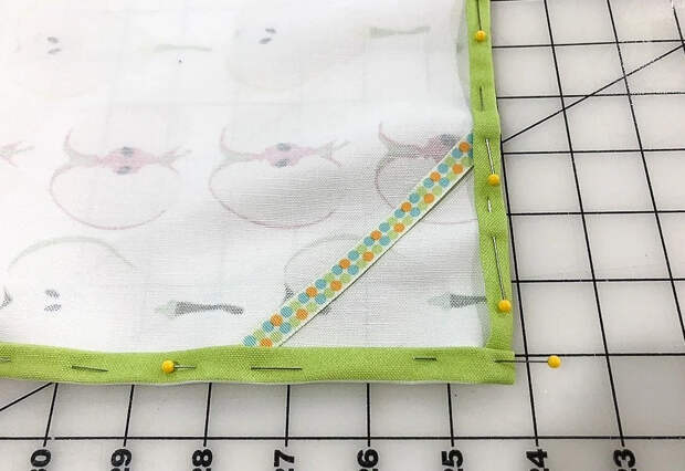 Закрепите подгибку портновскими булавками. Отрежьте отрезок тесьмы длиной 10−15 см. Вложите его по диагонали в один из уголков под подгибку и закрепите булавками.