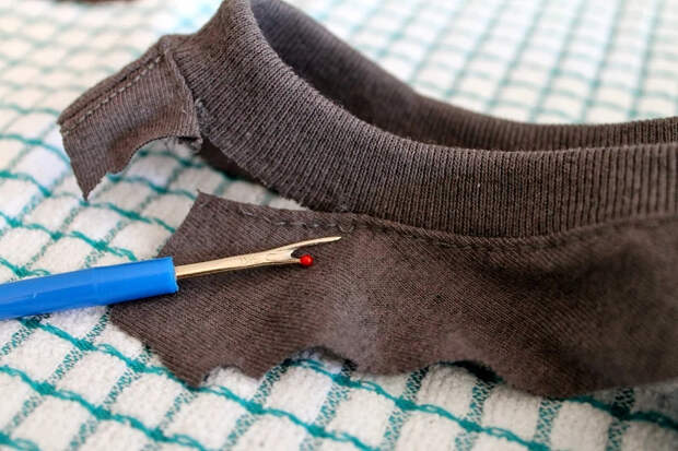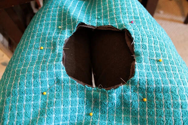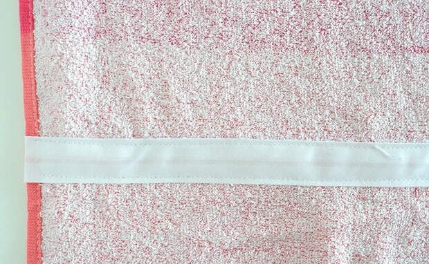 Потребуется небольшое полотенце и ненужная футболка. У футболки отпорите отделку горловины (можно использовать полоску трикотажа). По центру полотенца вырежьте круглое отверстие и пришейте к нему сложенную пополам полосу трикотажа.