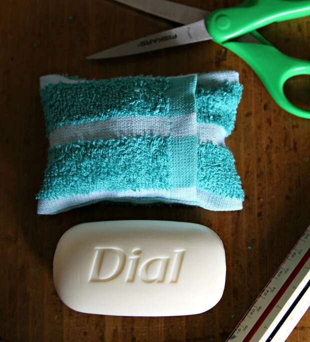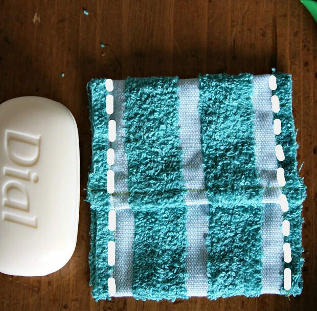 Такую мочалку не нужно то и дело намыливать, ведь мыло прячется внутри неё. Вырежьте прямоугольник их старого полотенца — размер детали должен быть таким, чтобы с нахлёстом обернуть им кусок мыла + припуски. Обработайте короткие края и сшейте мочалку, как показано на фото ниже.
