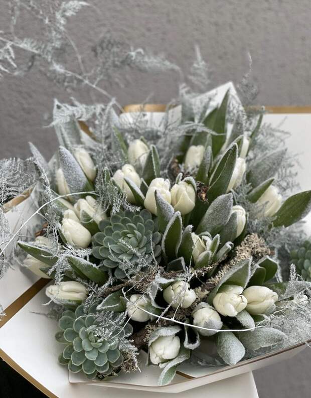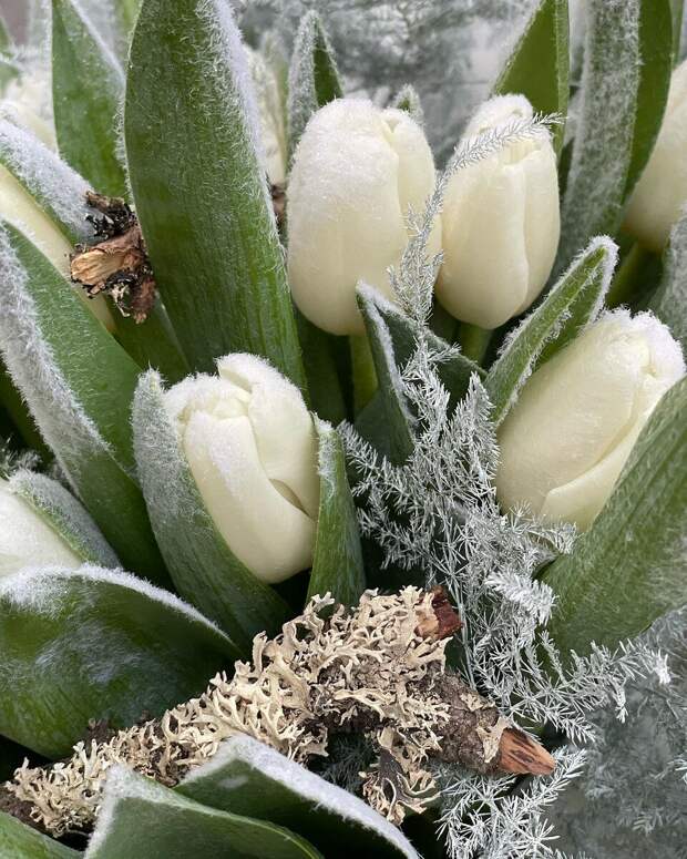Тюльпаны принято считать весенними цветами, но если подобрать сорта с бутонами белого, сиреневого или нежно-розового оттенка, они отлично подойдут в качестве основы для зимнего букета. Смешивайте их с белыми цветами (например, розами или гвоздиками), добавляйте эвкалипт. Важно получить композицию, в которой зеленых элементов будет столько же, сколько тюльпанов, или даже больше.