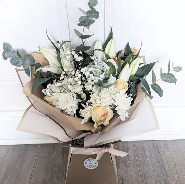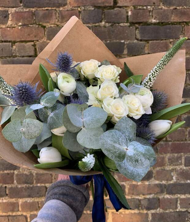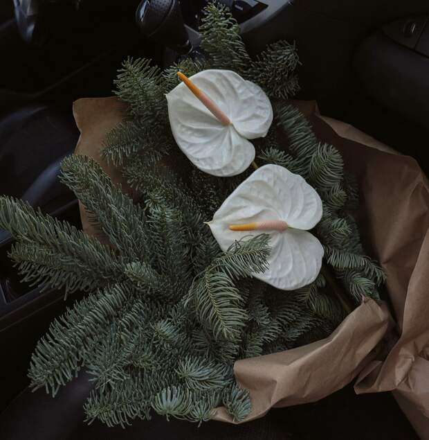 В цветочных магазинах можно найти огромное количество разных сортов эвкалипта, которые отличаются друг от друга в основном формой листьев. Самые популярные сорта для зимних букетов — популус, цинарея, бейби блю и гунни. Если вам близок минимализм, просто поставьте в стеклянную вазу простой формы охапку этих ветвей, налив немного воды. Если же хочется создать более праздничное настроение, добавьте в композицию мелкие белые цветы: гвоздики, ранункулюс, ваксфлауэр.
