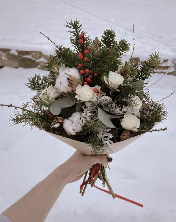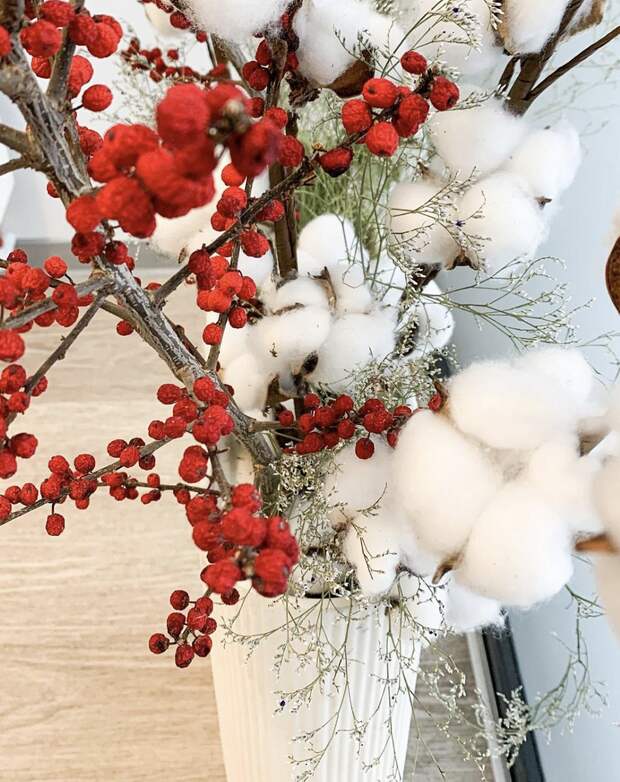 Их красные ягоды будут эффектно выделяться на белом фоне. Подойдут также хвойные ветви, шишки и чертополох. Садовые цветы вроде роз с хлопком обычно не смешивают.Соцсети блогера liubov.soboleva1